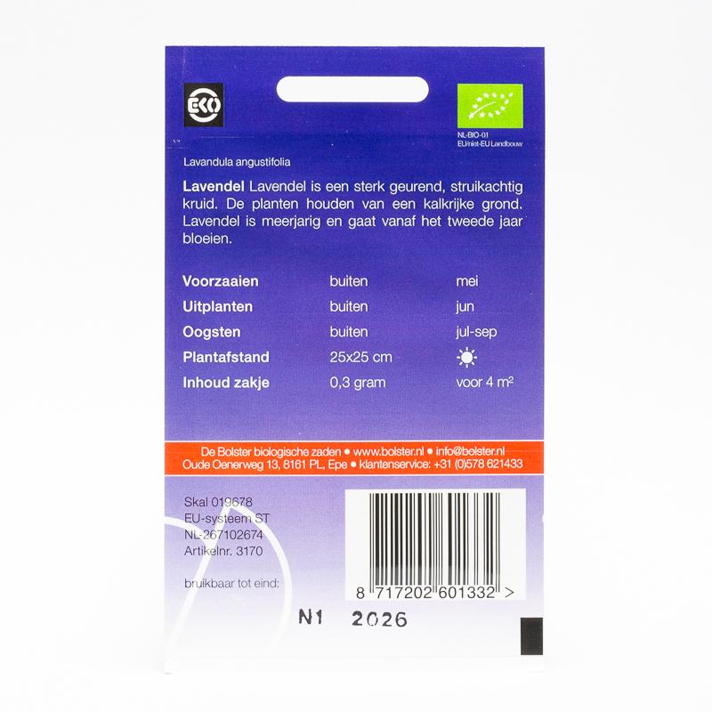Lavender is a bushy herb with a strong, recognizable smell. The leaves can be used in tea. Moreover, the dried flowers can help against insects indoors. Furthermore, oil can be extracted from the leaves and flowers and be used in soap. The seeds need cold nights to germinate, which can take a while. The plants prefer a soil with chalk. Lavender starts flowering from the second year onwards. The plants can be pruned best during spring, in order to prevent the plants from becoming too woody.