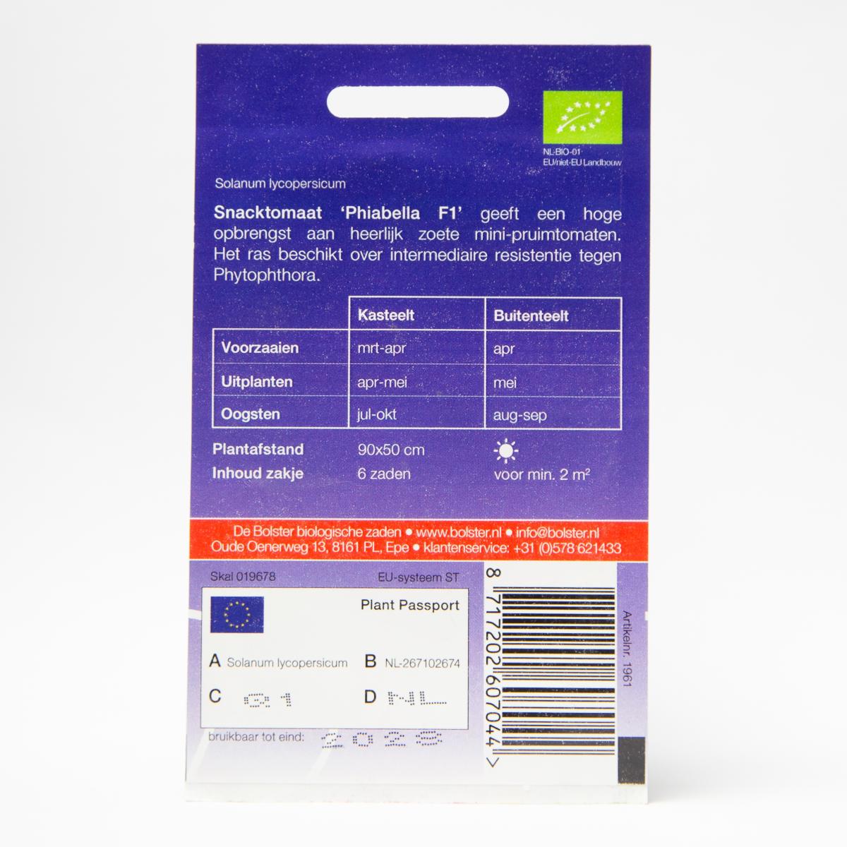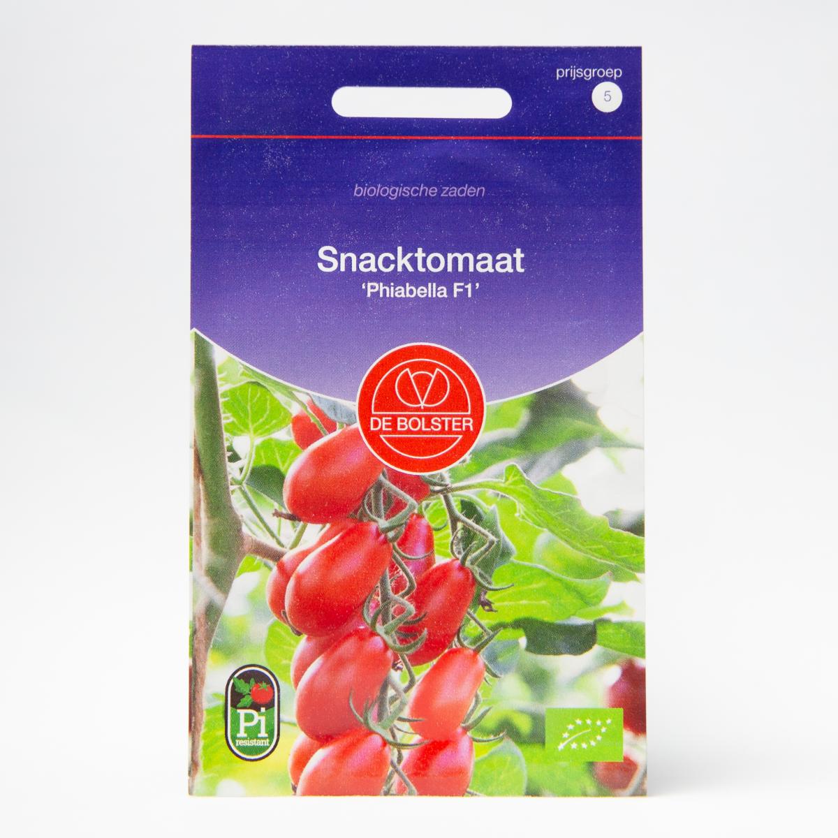 Snack Tomato 'Phiabella F1' delivers high yields of red mini plum tomatoes with a juicy and sweet flavor. This variety is suitable for outdoor cultivation. One packet covers a minimum of 2 m², and the planting distance is 90x50 cm.